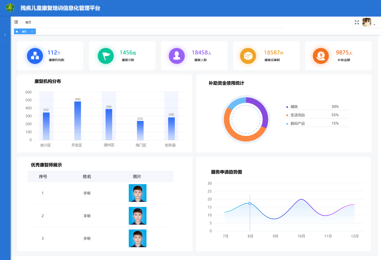 通過搭建“省-市-區(縣)-街道-社區”五級管理體系,建設殘疾人檔案、機構、輔具、康復、就業、慈善、無障礙等方面的綜合業務管理平臺,滿足主管部門的業務協同、數據交換、部門溝通等的扎口管理需求。借助“助殘服務直通車“,配套5大類助殘智能終端,提供輔具租賃、居家安防、居家探訪、兒童康復等助殘服務,實現殘聯工作統籌整合、有序管理,提高基層人員工作效率,提升殘疾人幸福感。