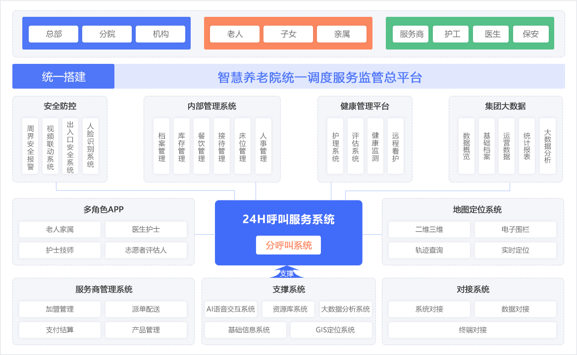 以集團(tuán)化管理作為頂層設(shè)計(jì),為養(yǎng)老機(jī)構(gòu)進(jìn)行信息化、智能化建設(shè),圍繞養(yǎng)老機(jī)構(gòu)基礎(chǔ)信息、綜合業(yè)務(wù)、健康評估、餐飲管理、護(hù)理服務(wù)、健康監(jiān)護(hù)、安全防護(hù)、大數(shù)據(jù)分析預(yù)警等搭建統(tǒng)一平臺,圍繞老人身體特征監(jiān)護(hù)、安全定位、全院一卡通行、房間智能化、安全預(yù)警、出入口門禁等方面部署智能終端,輔以不同角色的APP、小程序,最終實(shí)現(xiàn)領(lǐng)導(dǎo)總覽全局、工作人員方便實(shí)用、老人簡單易懂,子女實(shí)時(shí)掌握的格局。